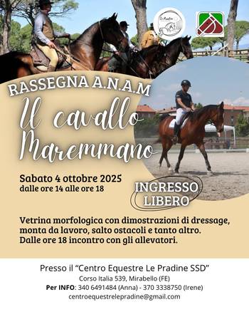 Grazie alla disponibilità delle strutture del Centro Equestre Le Pradine, l’ANAM organizza il giorno sabato 4 ottobre, dalle ore 14:00, la Vetrina del cavallo Maremmano, con la presentazione ai giudici dei soggetti rientranti nelle categorie del Campionato (come da art. 5 del regolamento) e, a seguire, con la presentazione a mano o da montati con dimostrazioni funzionali, come riprese di dressage, di monta da lavoro, di salto ostacoli o semplicemente di lavoro in piano.